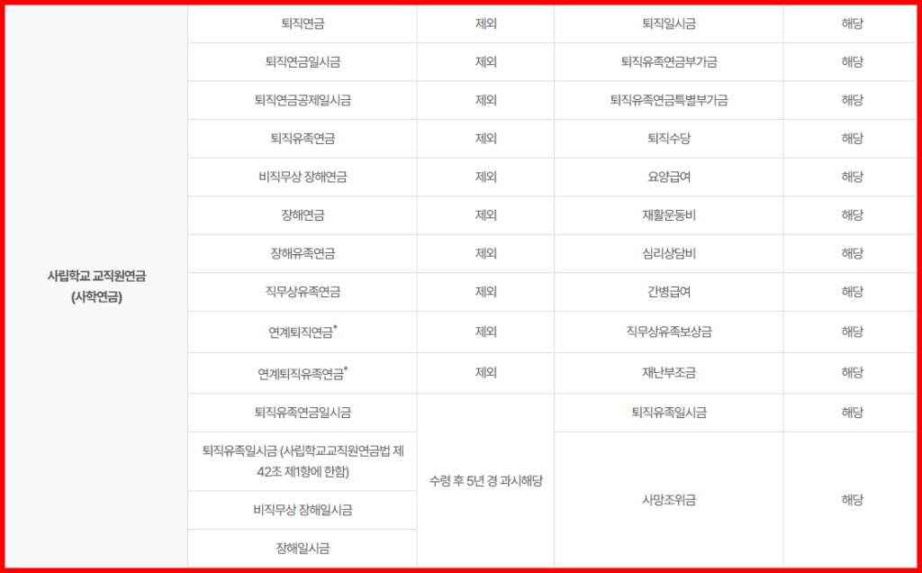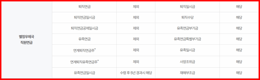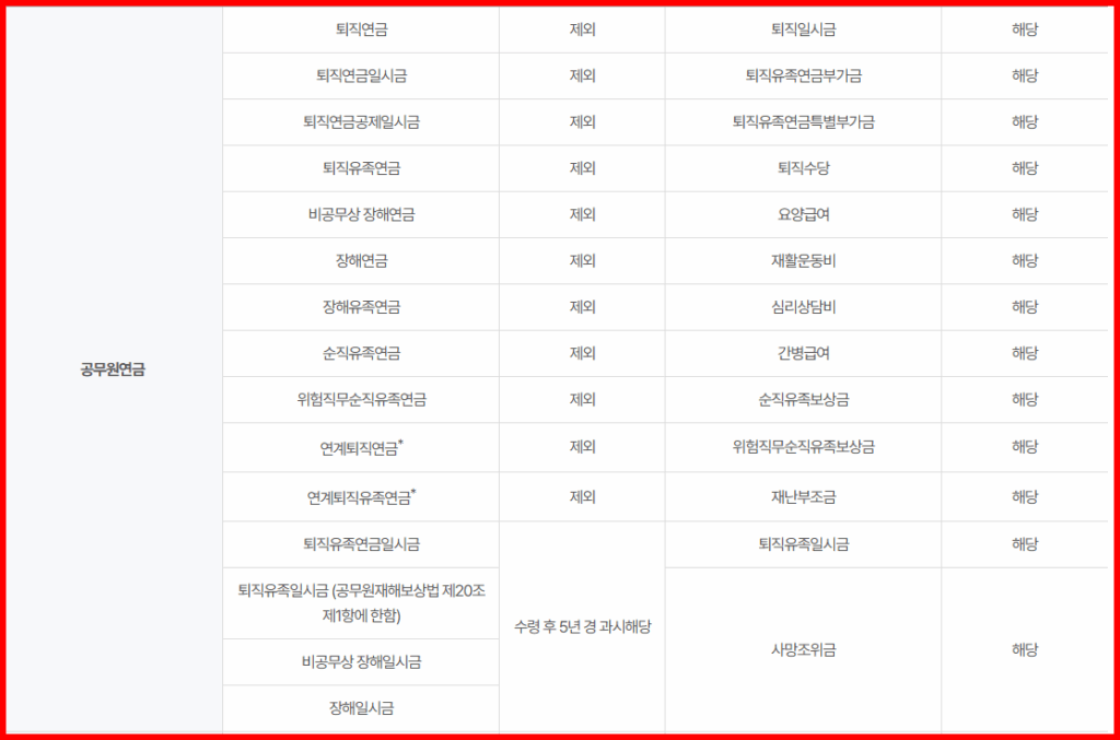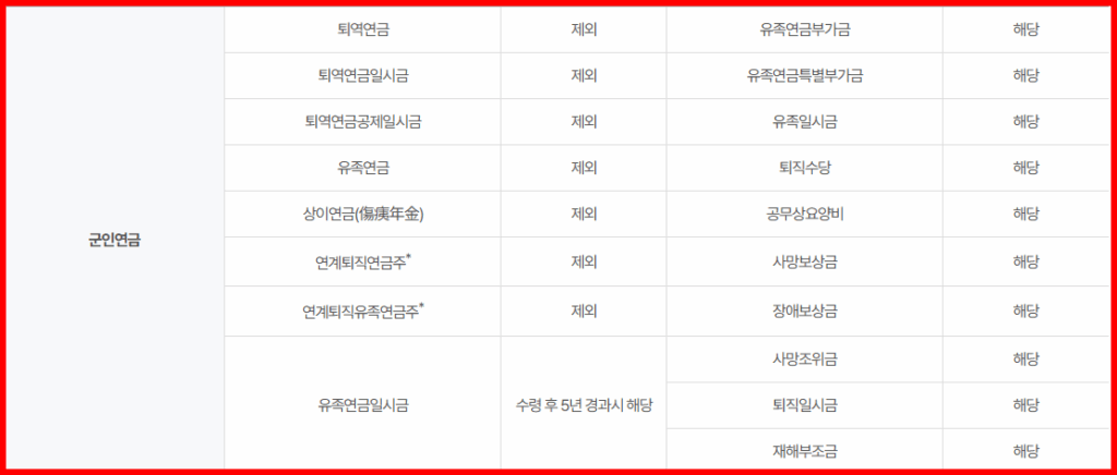 - 제외: 퇴직연금, 퇴직연금일시금, 퇴직유족연금, 장해연금, 순직유족연금 등